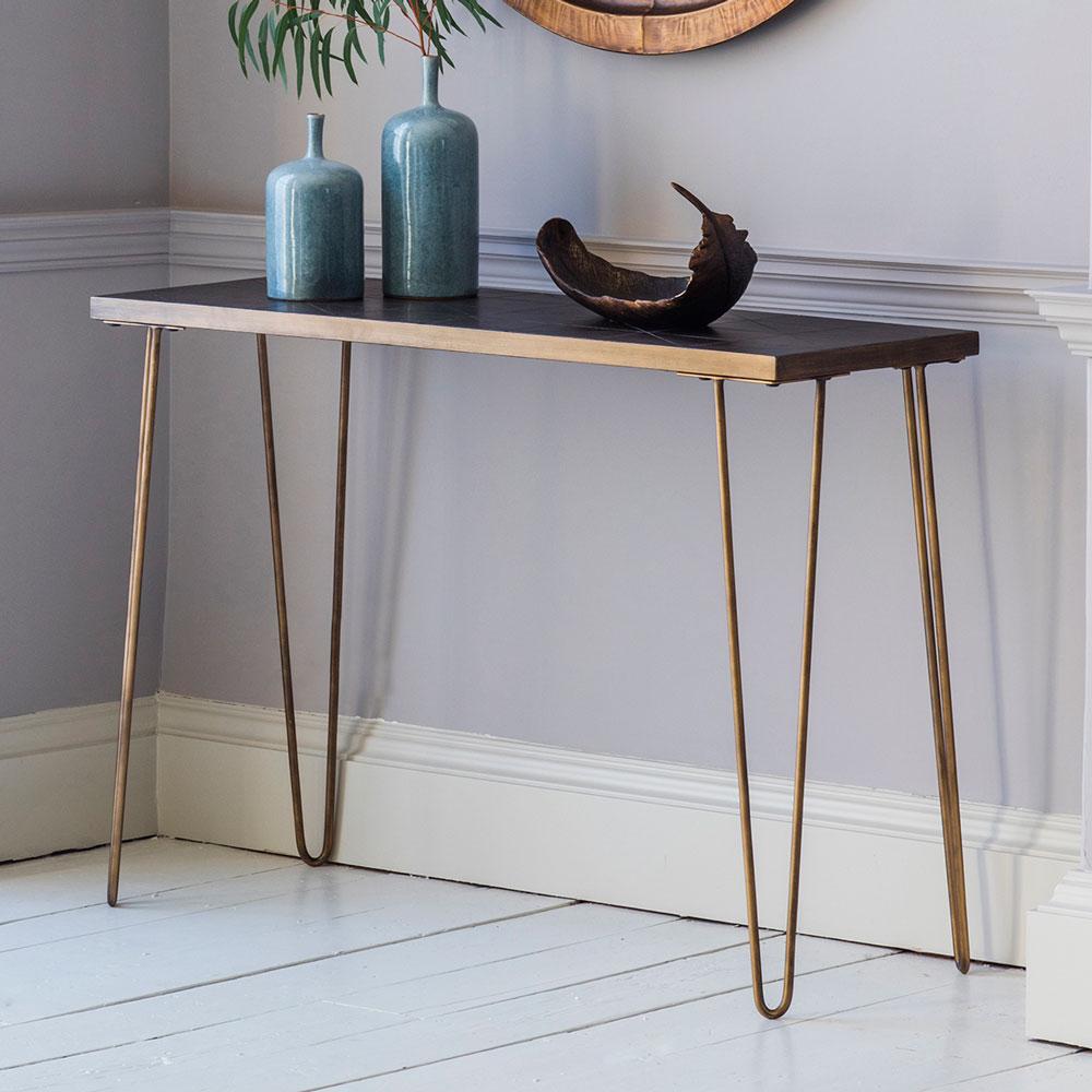 This console table has a modern and sleek aesthetic. It has inlaid fire-glazed bronze coloured tiles, in a geometric design, forming the table top, supported by with a narrow, sleek, brushed bronze metal base. The Canopy Console Table has a modern indoor-outdoor look the would look great in any hallway or living space.