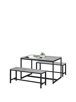 Julian Bowen Staten Concrete Effect and Metal 120 cm Dining Table + 2 Benches Channelling the popular industrial trend, its black metal legs support an eye-catching table that flaunts a concrete-effect foil finish. Measuring a generous 120 cm, it offers plenty of space for the 4 chairs that come with it. The matching benches provides a laid-back look and feel that contrasts brilliantly with the chairs. Please remember to measure your available space before ordering. Dimensions: Table – Height 75, Length 120, Width 80 cm Bench – Height 45, Width 110, Depth 36 cm Assembly: Self Assembly Depth: 120 CM Height: 75 CM Material Content: Metal & MDF Width: 80 CM Black coated metal frame and concrete effect foil Strong and durable construction Modern design suitable for a range of décor Part of the Julian Bowen Statten dining and Occasional range 12 month product guarantee. Table Height to underside (in cm): 73 Table Length (in cm): 80 Table Width (in cm): 120 Table Assembly Type: Flat Pack Table Weight (in Kg): 19.8