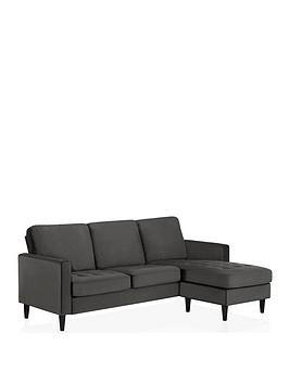 CosmoLiving Strummer Velvet Reversible Corner Group Sofa in Green or Grey H 89.9 x W 207.3 x D 151.4 cm Style up your sanctuary CosmoLiving’s Strummer sofa is a sectional piece that’s covered in a lush velvet upholstery. Choose go-with-everything grey or, if you prefer a touch more colour, the green option. Perched on sleek contrasting black wooden legs for durability, its narrow mailbox arms and modern tufting gives the fashionable some vintage glam vibes. Choose your side This corner group can be left- or right-hand facing to suit the layout of your space, so it’s convenient as it is comfy. Speaking of comfort, check out that chaise end – ideal for putting your feet up after a long day! Free Swatch Service Get a feel for this fabric before you buy with our FREE swatch service. Simply email  [email protected]  with your name and address, along with the sofa range name, item number, colour choice and the name of the retailer’s website you’re ordering from. Your swatches will be delivered within 5 working days (subject to availability). Platinum Delivery Service After taking your new furniture to your room of choice, a dedicated 2-person team will unpack, assemble and position it in your preferred place, then remove all the packaging. Please note: this service excludes all Offshore Islands and Ireland. Please remember to measure your available space before ordering. Dimensions: Height 89.9, Width 207.3, Depth 151.4 cm (approx.) Assembly: Part Assembled Depth: 1514 MM Height: 899 MM Width: 2073 MM •Modern small space reversible sectional sofa with floating chaise. •Upholstered in an elegant velvet fabric that is easy to wipe clean. •Sturdy construction featuring black cone legs, a mailbox arm design and tufting on its seat.