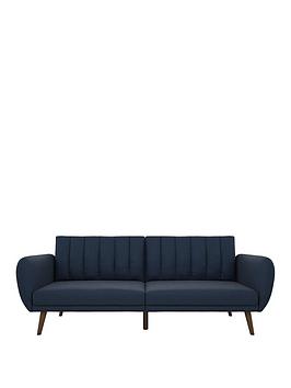 Novogratz Brittany Sofa Bed Be embraced by the comfortable cushioning of the Brittany linen futon. With its ribbed tufted cushioned back, the Brittany Linen futon gives your body all the support you need to sit and relax for hours. The combination of curved armrests and slanted legs work together to provide a unique rounded look that stands out. The linen upholstery adds another element of elegance making this a perfect statement piece for any living space. Assembly: Self Assembly Depth: 876 MM Height: 800 MM Width: 2070 MM Back Type: Fixed Back Cushion •Stylish linen upholstery wipes clean easily. •Ribbed tufted cushioned back with slanted oak coloured wooden legs. •Sturdy wood frame construction that is stable and durable. •Comfortable polyester and foam filling. Available in multiple colors.