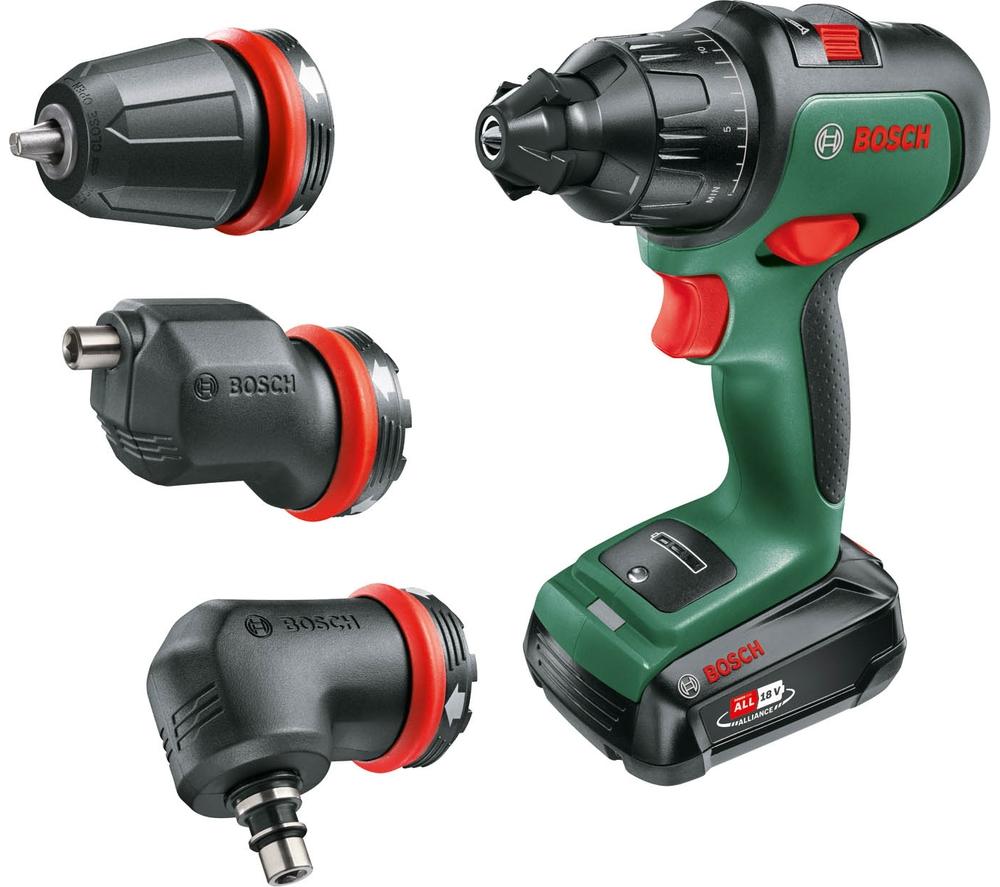 The Bosch AdvancedImpact 18 Cordless Combi Drill is a highly-versatile, professional tool for your DIY projects. Combining a drill and impact drill into a single tool, you can drive screws and drill holes in wood or even masonry.And 3 adapters help you solve various problems. The keyless chuck adapter is your standard all-rounder, the offset angle adapter helps you reach difficult spots, and the angle adapter lets you drive screws at 90 degrees.It comes with a18-volt batteries which also works with the entire Bosch Home & Garden tools range.