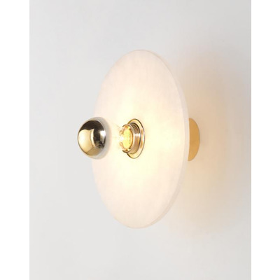 Finished in a range of colours including: gold, chrome, black and white. The disc which is available in two sizes is finished in white alabaster which is a mineral or soft rock. With only a small base fitting the wall light sits nearly flush to the wall.Picture shows gold with alabaster disc.