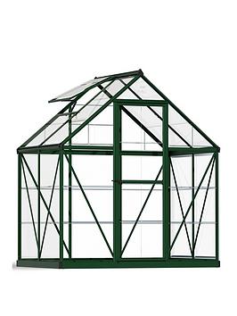 Canopia by Palram Harmony 6X4 – Greenhouse Depth: 126 CM Height: 208 CM Width: 185 CM Virtually unbreakable crystal-clear polycarbonate panels provide over 90% light transmission yet block harmful UV rays 100% UV protected panels do not turn yellow or become brittle over time Strong, green powder coated, corrosion resistant aluminium frame for long lasting durability Easy assembly – sliding panels’ assembly system, ready to assemble pre-drilled profiles, pre-cut sliding panels, and all hardware included Maintenance free