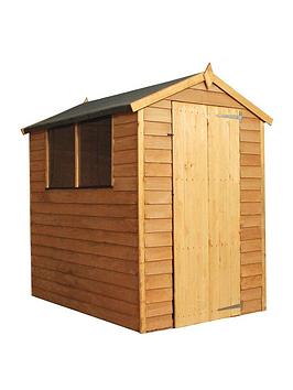 Mercia 6 x 4 ft Overlap Apex Shed – ideal for households with a smaller outdoor space. Made in the UK, with ethically sourced FSC certified timber this shed is perfect for those that need an outdoor storage solution without breaking the bank. The shed walls are made using horizontal boards that overlap each other to create a solid panel that encourages rainwater to run off the sides , protecting your stored possessions from the elements. Solid sheet board is used to make the floor and roof , a durable material made up of several layers of tightly compacted oriented strands and perfect for everyday general use and storage. The shed is completed with thick 1 x 1-inch wooden framing to support the overlap panelling internally, creating a rigid, long-lasting structure . A classic apex roofline offers plenty of headroom inside – ideal for storing taller items such as strimmers and ladders. Robust roofing felt, fixtures and fittings are all supplied as standard , alongside our detailed instructions to ensure a simple, stress-free assembly process. To ensure your Mercia shed looks great and lasts the test of time, it comes with a conditional 10-year Anti-rot guarantee , as well as a 12-month manufacturer’s warranty. Annual re-treatment is required to maintain your building and the Anti-rot guarantee. Depth: 1842 MM Height: 1920 MM Width: 1318 MM Anchoring Included: N Assembly Service: N Base Supplied: N Door Depth (in cm): 1 Door Height (in cm): 160 Door Width (in cm): 66 Floor Material: Wood Gutters: N Interchangeable Pieces: Y Lockable: Y Number of Doors: 1 Number of Windows: 2 Roof Material: Wood Ventillation: N Wood Thickness (in mm): 7 Wood Treatment: Dip Treated The walls are made using horizontal boards that overlap each other, creating a solid panel that encourages rainwater to run off your building. Solid sheet board is used to make the floor and roof, a durable material made up of several layers of tightly compacted oriented strands. Robust roofing felt, fixtures and fittings are all supplied as standard, alongside our detailed instructions and manufacturer’s recommendations The building is completed with thick wooden framing to support the overlap panelling internally, creating a rigid, long lasting structure. Styrene glazed shatterproof windows, are fitted, this is a much safer alternative to traditional glass windows, ideal for buyers with busy gardens. A traditional apex roofline, the sloping roof is also very practical as it helps rainwater to run off the roof.