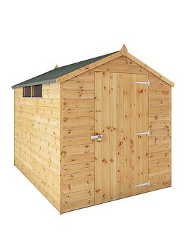 MERCIA 8 x 6 Shiplap Security Apex Looking for ultra-secure garden storage? Our 8ft x 6ft Security Apex Shed is the perfect solution! Packed with security features, this high-quality garden building will keep your possessions safe. Strategically placed Styrene glazed windows keep your belongings out of sight. Whilst the use of Unifix clutch head anti-vandal screws provide you with further peace of mind. A secure and sturdy padlock is also supplied as standard with this garden shed. Which features a weatherproof thermoplastic jacket, brass cylinder and keyhole cover. Providing your building with added protection. Additional features also include a tamper-proof hasp and staple. Manufactured using chrome-plated hardened steel for enhanced durability. We manufacture this garden building right here in the UK, using FSC certified timber. So you can be confident in the quality of this garden shed. Constructed using premium Shiplap cladding this shed provides you with a long-lasting storage space. As the interlocking design creates a strong and waterproof seal. High-quality tongue and groove boards are also used to form the roof and floor of this shed. Meaning that this building can withstand heavy wear from general day-to-day use. Robust roofing felt, fixtures and fittings are all supplied as standard. Alongside our detailed instructions and manufacturer’s recommendations, to ensure a stress-free assembly. All our buildings come with a 10 year Anti-rot guarantee. This ensures your garden building looks great and lasts the test of time. Just make sure to treat your garden shed annually with a wood preservative and a waterproof top coat. Then your guarantee will be good to go!” Depth: 2408 MM Height: 1989 MM Width: 1892 MM Anchoring Included: N Assembly Service: N Door Depth (in cm): 4 Door Height (in cm): 160 Door Width (in cm): 86 Floor Material: Wood Gutters: N Interchangeable Pieces: Y Lockable: Y Number of Doors: 1 Number of Windows: 2 Roof Material: Felt Ventillation: Y Wood Thickness (in mm): 8 Wood Treatment: Dip Treated 12mm Shiplap Cladding Tongue & Groove Roof Tongue & Groove Floor Single Door with Padbolt Durable Roofing Felt Reverse Apex Roof FSC Certified Timber Security Windows 10 Year Conditional Anti Rot Warranty Dip Treated – Requires Further Timber Protection