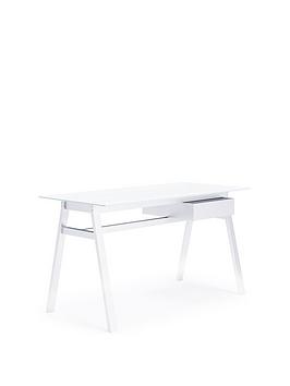Richmond 1 Drawer Desk in White Simple yet stylish, the Richmond desk has a trendy trestle design that will add a modern aesthetic to your working from home days. The metal frame is painted in a sleek white shade, while the colour matched glass top adds a hint of shine to your home office. The single drawer underneath the 140 cm table top offers storage for stationery and other essentials, and you can match it with one of the equally modern office chairs from our extensive range (available separately). This desk is also offered in black (see item number UQJQX) and grey (UQJQX).   Please remember to measure your available space before ordering. Dimensions: Height 76, Width 140, Depth 65 cm Assembly: Self Assembly Depth: 650 MM Height: 760 MM Width: 1400 MM Stylish painted metal frame Coloured glass worktop Under desk drawer Working area (mm): W 1400 x D 650 mm