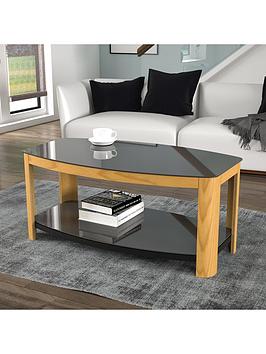 AVF Affinity Coffee Table in Oak/Black From AVF’s Affinity collection, this stylish coffee table features cool curved corners and a smartly grained real oak veneer. This is contrasted by tempered black safety glass that ensures it matches the Affinity range of TV units (available separately) for a consistent look throughout your living room. Please remember to measure your available space before ordering. Dimensions: Height 45, Width 100, Depth 55 cm Assembly: Self Assembly Depth: 55 CM Height: 45 CM Material Content: Wood and Glass Width: 100 CM Handle Material: Wooden Designed to perfectly compliment the AVF Affinity Range of TV Stands. Beautiful Oak Real wood Veneer Stylish Black Tempered Safety Glass