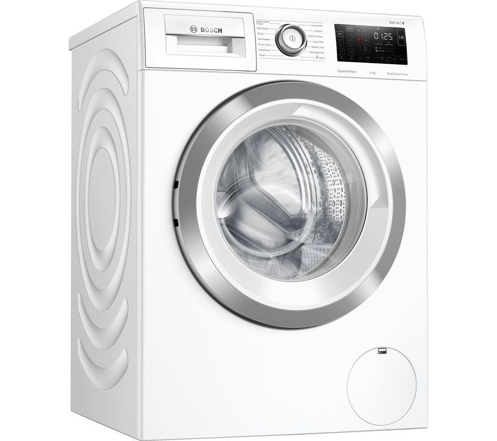 Go green You won’t need to run another wash just because you’ve left something out of the wash. Reload lets you add it into the wash, which means you won’t need to use energy and water on a whole separate wash. Remove stubborn stainsGet rid of stains easily with the Bosch Serie 6 WAU28R90GB 9 kg 1400 Spin Washing Machine. It has an anti-stain setting that adjusts the wash to remove common stains like grass, oil and red wine. So, you won’t have to use a separate stain remover in advance.Quiet and reliableRelax at home without the whine of a noisy washing machine in the background. Bosch’s EcoSilence Drive motor uses magnets instead of brushes, so the machine is incredibly quiet, even on the spin cycle. Because there are fewer moving parts inside the machine, there’s also less wear and tear over time – so the motor is more reliable and will last longer.Special programs and functionsSave time and energy with a range of wash functions and settings. SpeedPerfect mode can wash a full load of laundry 65% faster, while the Sportswear program cleans your kit thoroughly without leaving it creased.Pause and reloadDropped a sock? No worries. The Reload function gives you a second chance, letting you add and remove clothing after the wash cycle has started.